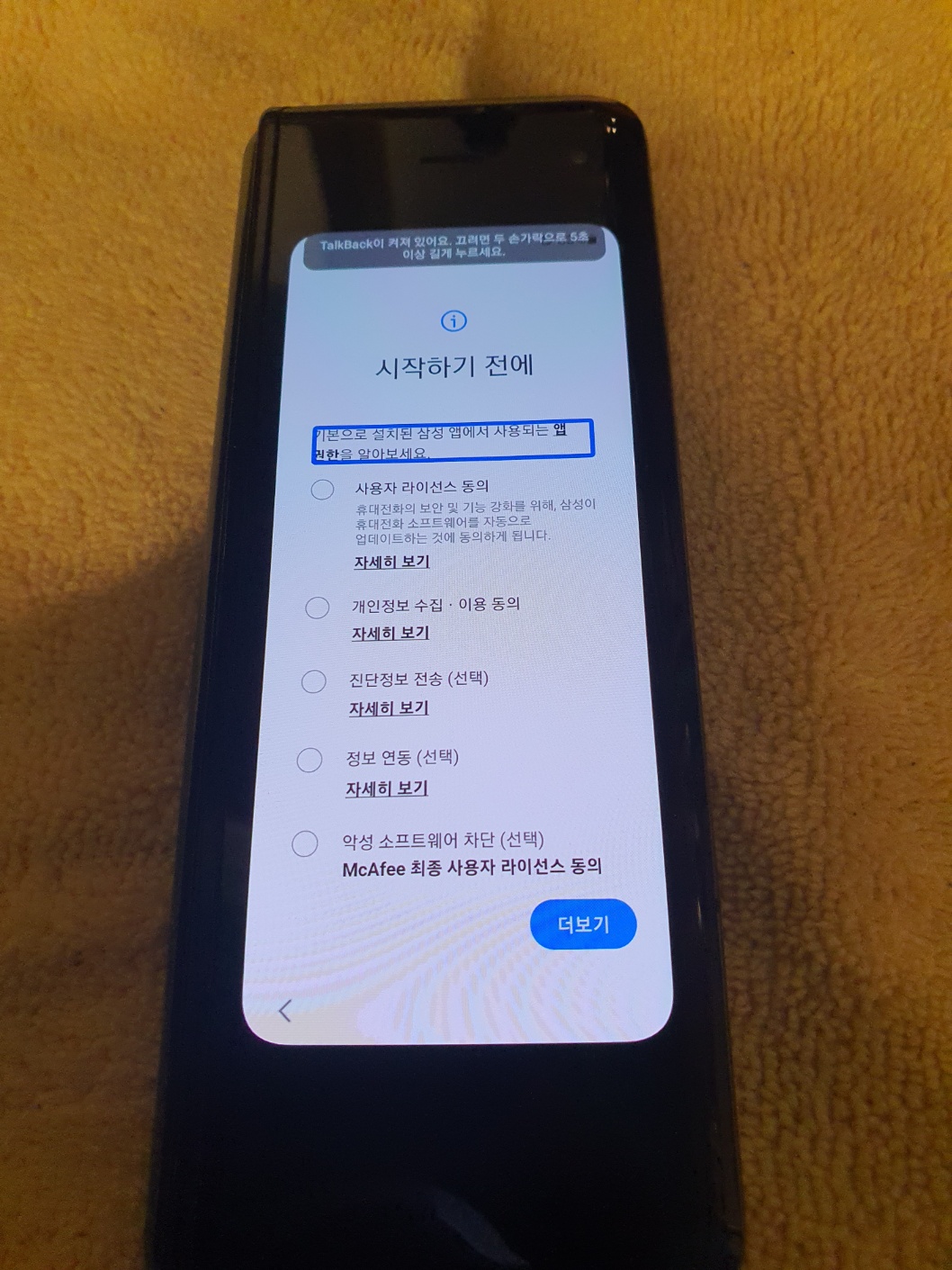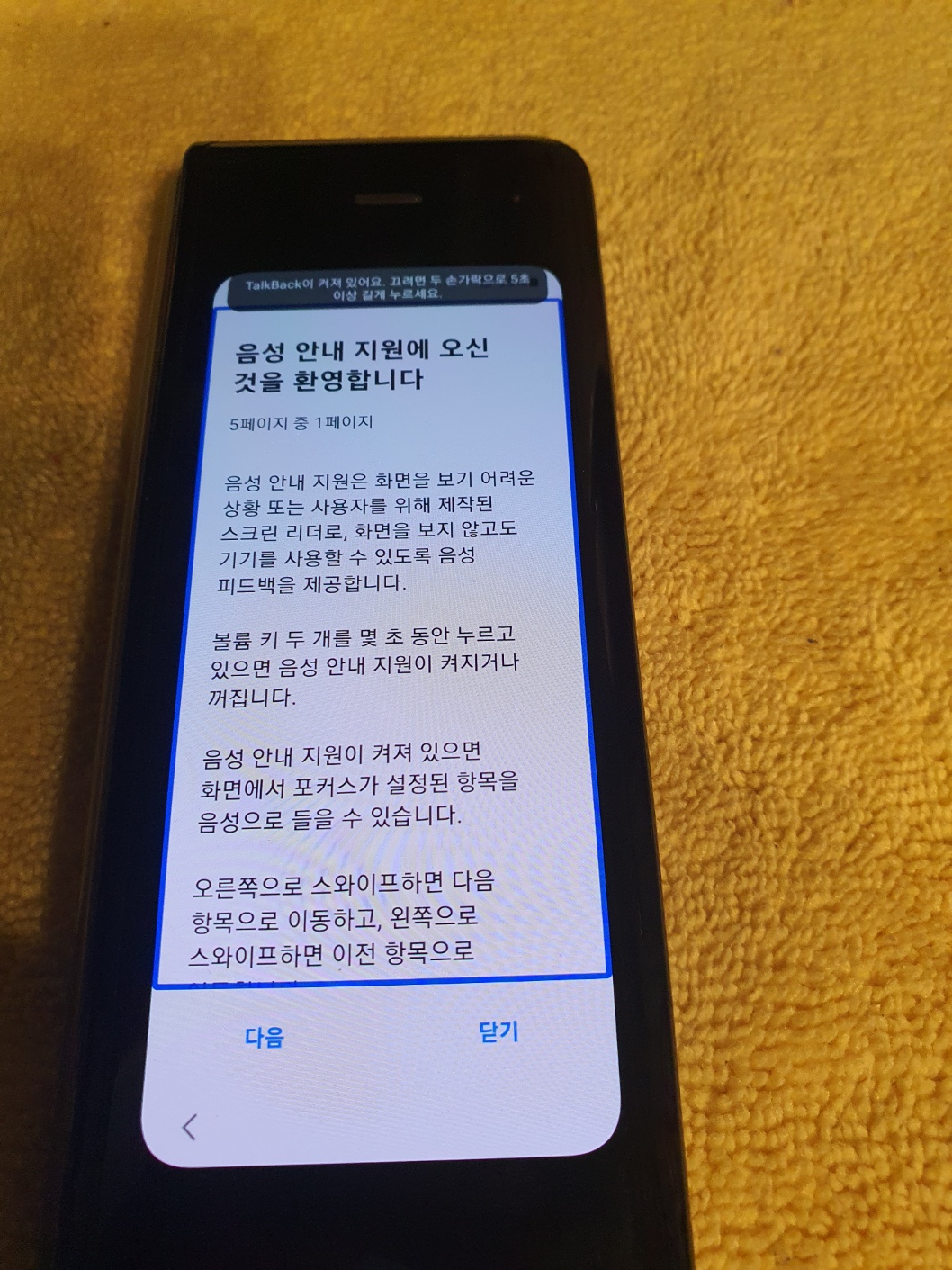 이후 적당한 터치를 무작정 진행하면 어느 순간 "시작됨"이라는 음성이 들리고 "시작하기 전에" 라고 하는 음성이 들리면 폴더를 접고 외부 화면을 확인합니다.