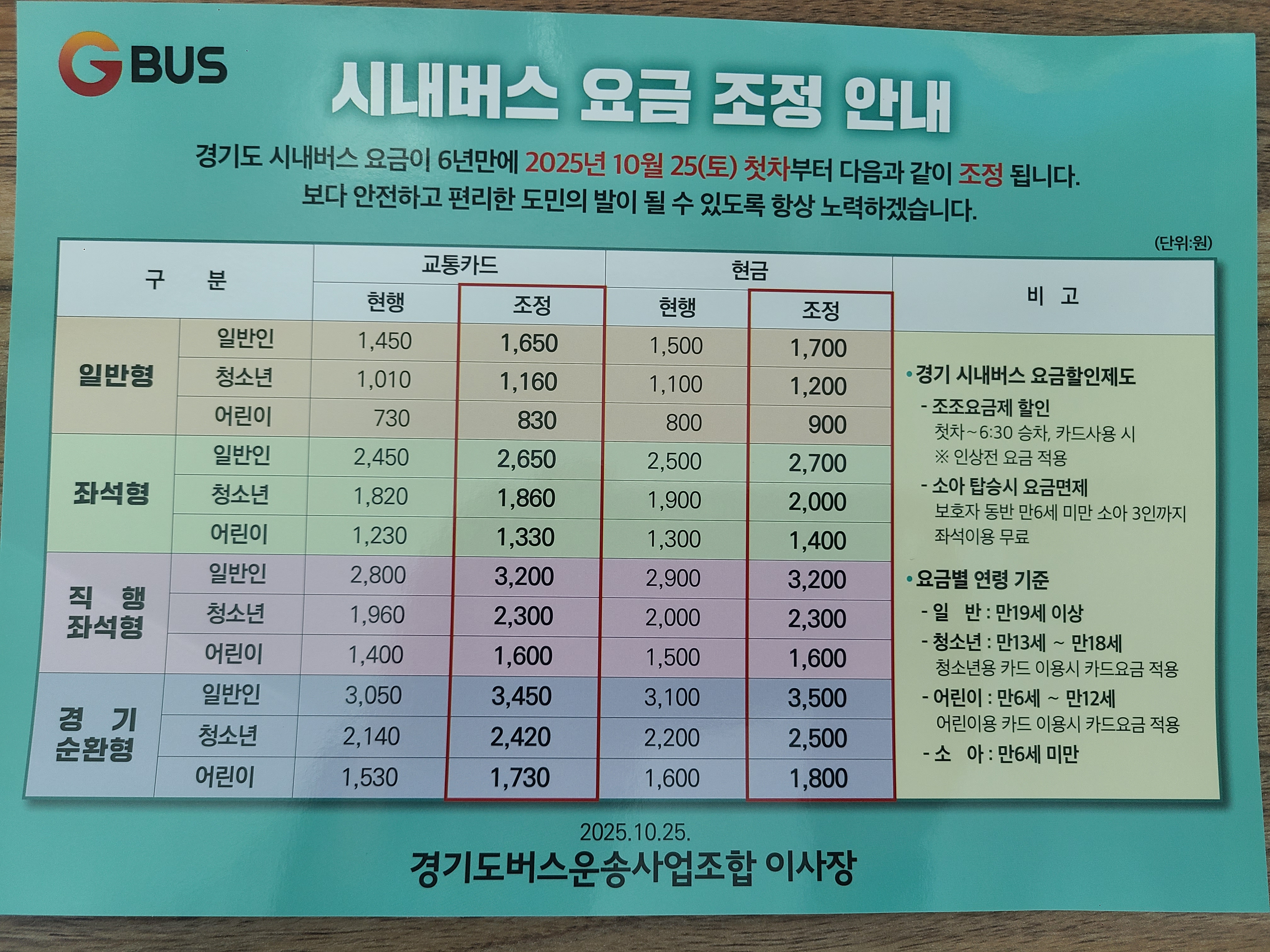 2025년 10월 25일부터 경기도 전 지역 시내버스 요금이 동시 인상됩니다. 기본요금 150원, 환승 시 추가 요금 100원씩 오르면서 대중교통 이용자들의 부담이 크게 늘어날 예정입니다. 카드 이용 시와 현금 이용 시 요금 차이도 기존보다 확대됩니다.
