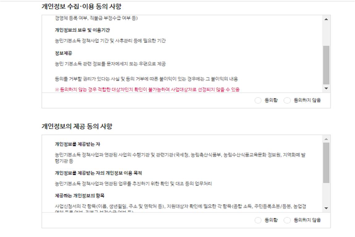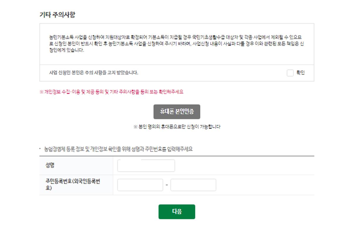 회원가입 - 로그인 - 농민기본소득 신청하기 - 지역별 신청가능 여부 확인 - 개인정보 동의 - 주의사항 동의 - 본인 핸드폰 인증 - 신청 진행