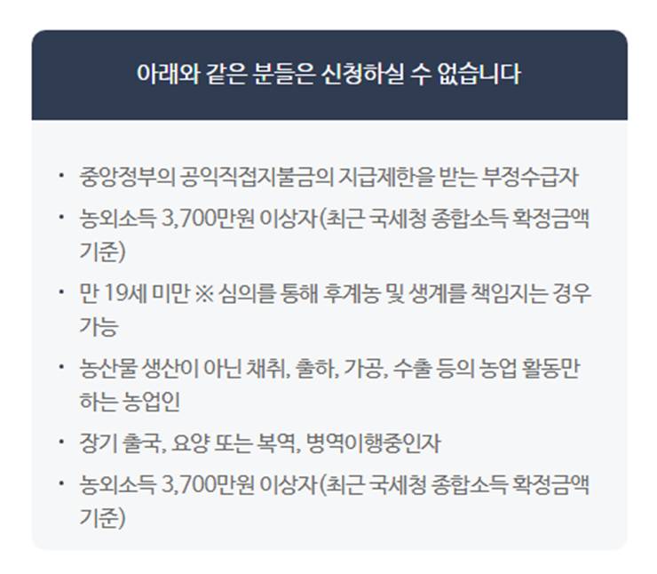 참고해야 할 주요한 사항으로서 농민기본소득을 지급받게 되면 국민기초생활 수급대상자 및 각종 사업에서 제외될 수 있으니 반드시 확인 후 신청하길 바랍니다.