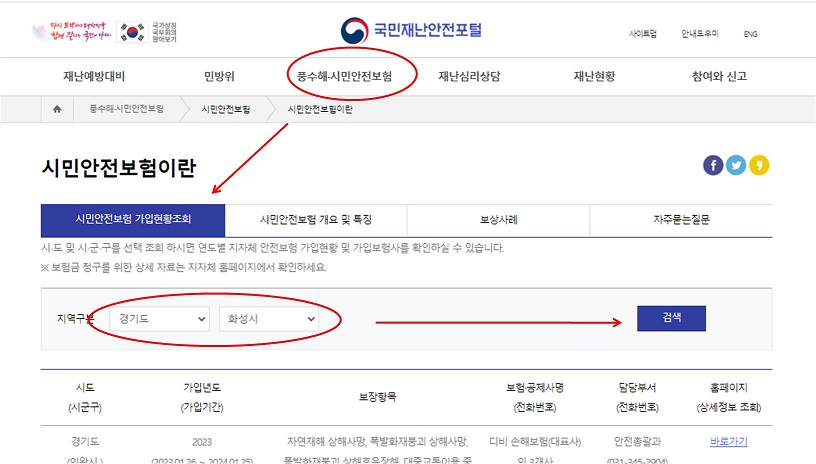 한편, 행정안전부는 시민안전보험을 몰라 혜택을 받지 못하는 국민이 없도록 지자체 홈페이지뿐만 아니라 국민재난안전포털(www.safekorea.go.kr → 정책보험)에서도 전국의 시민안전보험 정보를 확인할 수 있도록 하고 있습니다.